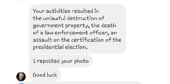 Baldwin shared a photo that Roice posted (above) of the Jan. 6 rally and wrote that she is an “insurrectionist.” Baldwin also privately messaged her with false accusations and a sarcastic “good luck.” See here: